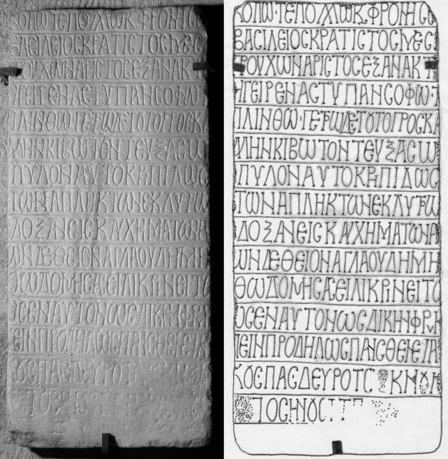 Con grande impegno e con lodevolissimo ingegno il molto valente Basilio Mesardonites, che si distingue per l’eccellenza, di stirpe imperiale (εξ ανακτων το γενοσ), ha innalzato il Pretorio con estrema perizia poiché ha provveduto a questo con mattoni duri come la pietra, ha costruito una nuova arca fortificata, ha edificato dalle fondamenta questo antemurale per la protezione degli alloggi delle truppe, per la gloria e il vanto del Palazzo. (Spinto) poi da un sincero anelito ha costruito in pietra la chiesa del glorioso Demetrio, che ha eretto come un faro affinché essa illumini chiaramente in (tutta) la sua gloria coloro che abitano qui e che (vi) abiteranno …